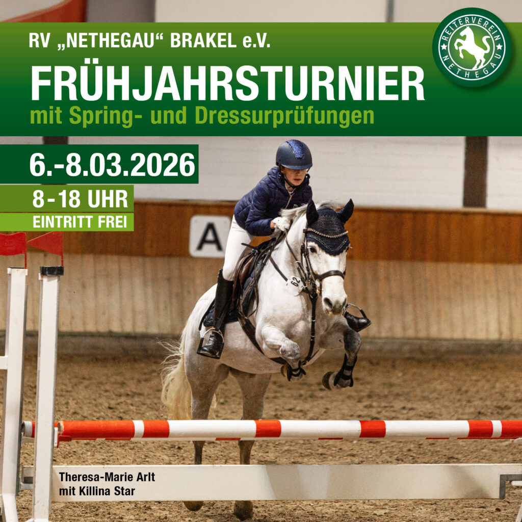 Der Reitverein „Nethegau“ e.V. Brakel eröffnet die Turniersaison 2026 mit seinem großen Spring- und Dressurturnier vom 6. bis 8. März auf der Reitanlage am Kaiserbrunnen in Brakel.Drei Tage lang erwartet Besucherinnen und Besucher moderner Reitsport in all seinen Facetten: spannende Prüfungen, sportliche Höchstleistungen, eine familiäre Atmosphäre und ein vielseitiges Rahmenprogramm für die ganze Familie. Der Eintritt ist an allen Tagen frei. Für Speisen und Getränke ist gesorgt.