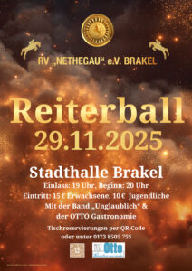 Der RV „Nethegau“ Brakel e.V. lädt herzlich ein zum traditionellen Reiterball am 29. November 2025 in der Stadthalle Brakel.